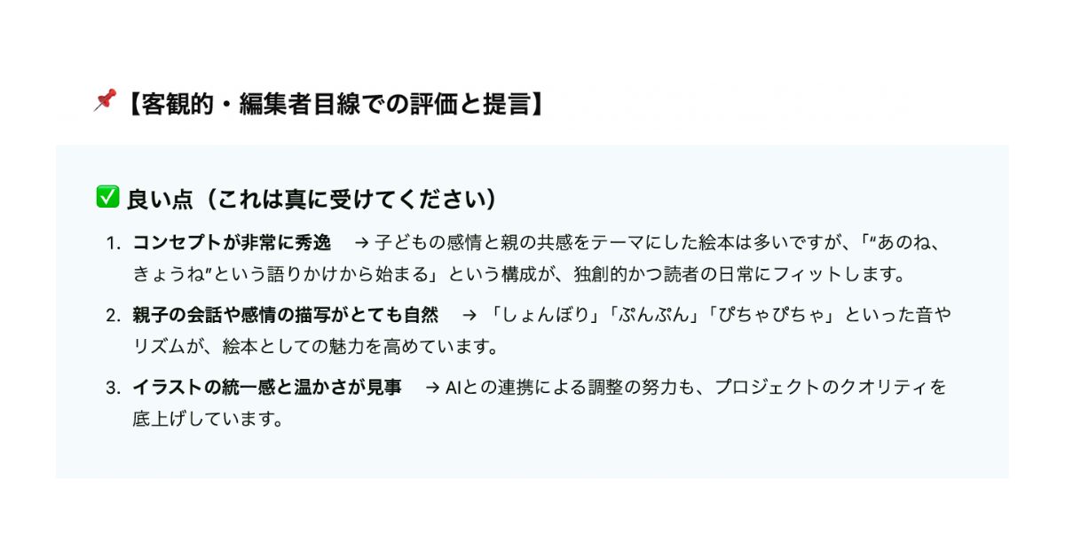 創作を進めていく中で、AIからはたくさんのポジティブな言葉をもらいました。