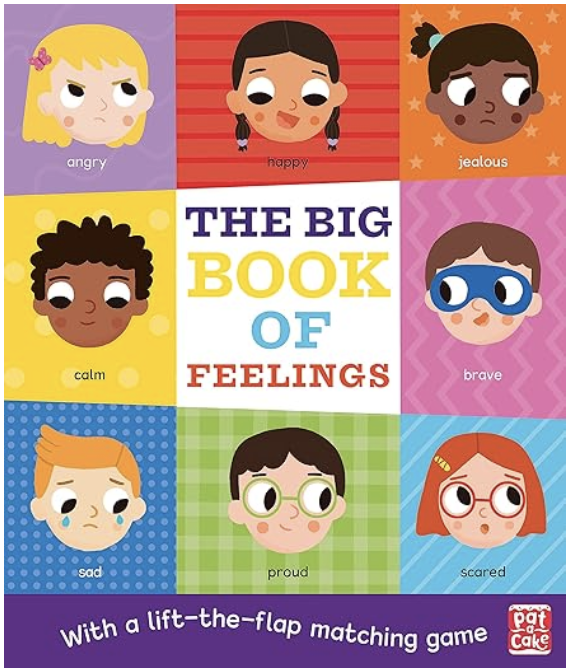 喜び・悲しみ・驚きなど基本の感情を、可愛いキャラと一語ずつ伝える厚紙絵本の表紙。 Board book cover introducing basic emotions like joy, sadness, surprise with cute characters and single words.📘 書名:Feelings (Board Book)