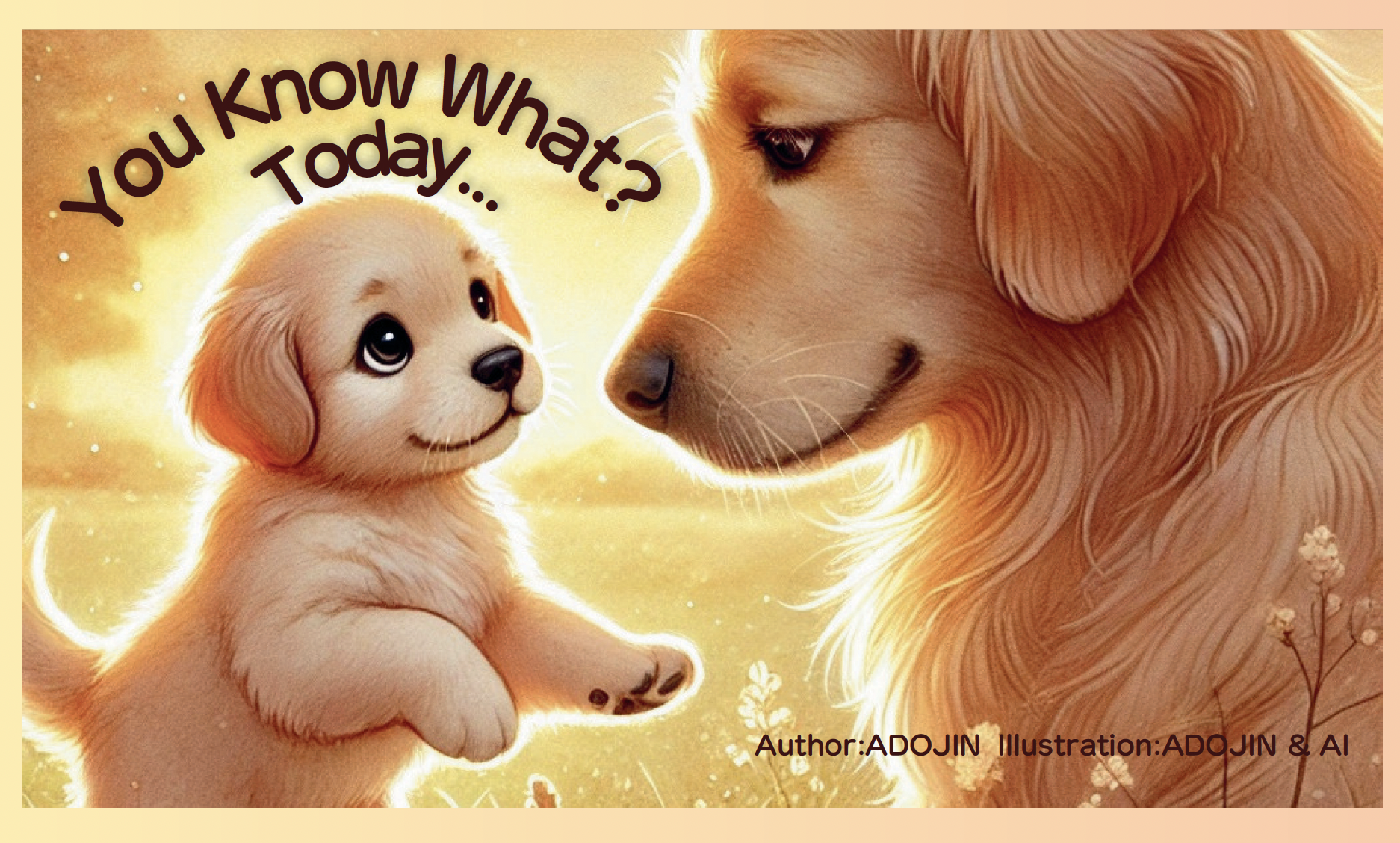 夕暮れの草原で向かい合うゴールデンレトリバーの親子。子犬が「You Know What? Today…」と語りかけている絵本表紙。 A golden retriever puppy and parent gaze at each other warmly in a sunset field. The picture book title reads “You Know What? Today…”.📘 書名:You Know What? Today…